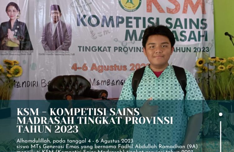 Alhamdulillah, pada tanggal 4 – 6 Agustus 2023 siswa MTs Generasi Emas yang bernama Fadhil Abdullah Ramadhan (9A) mengikuti KSM (Kompetisi Sains Madrasah) tingkat...