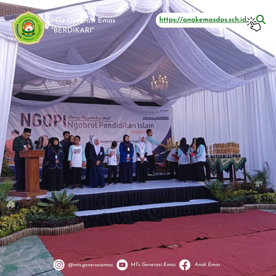 MTs Generasi Emas mewakili Kota Denpasar di tingkat Provinsi pada kegiatan yang dilaksanakan pada 5 Juli 2023 di Jembrana. Alhamdulillah wa Barakallah kepada ananda Rafa, Kenzo dan Aniela yang berhasil meraih juara 2 di ajang Madrasah Fest dalam bidang Explaining Holy Qur’an (EHQ).