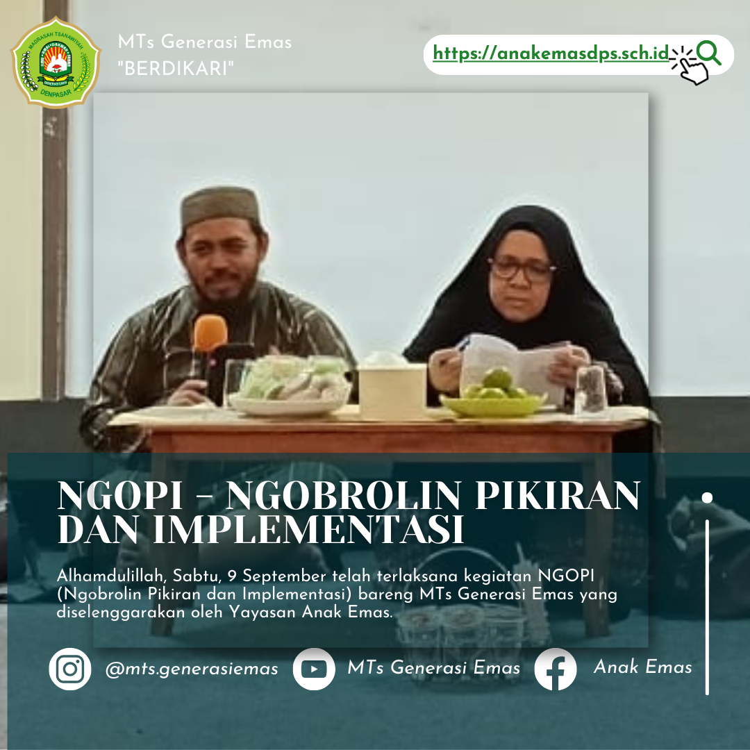 Alhamdulillah, Sabtu, 9 September telah terlaksana kegiatan NGOPI (Ngobrolin Pikiran dan Implementasi) bareng MTs Generasi Emas yang diselenggarakan oleh Yayasan Anak Emas.