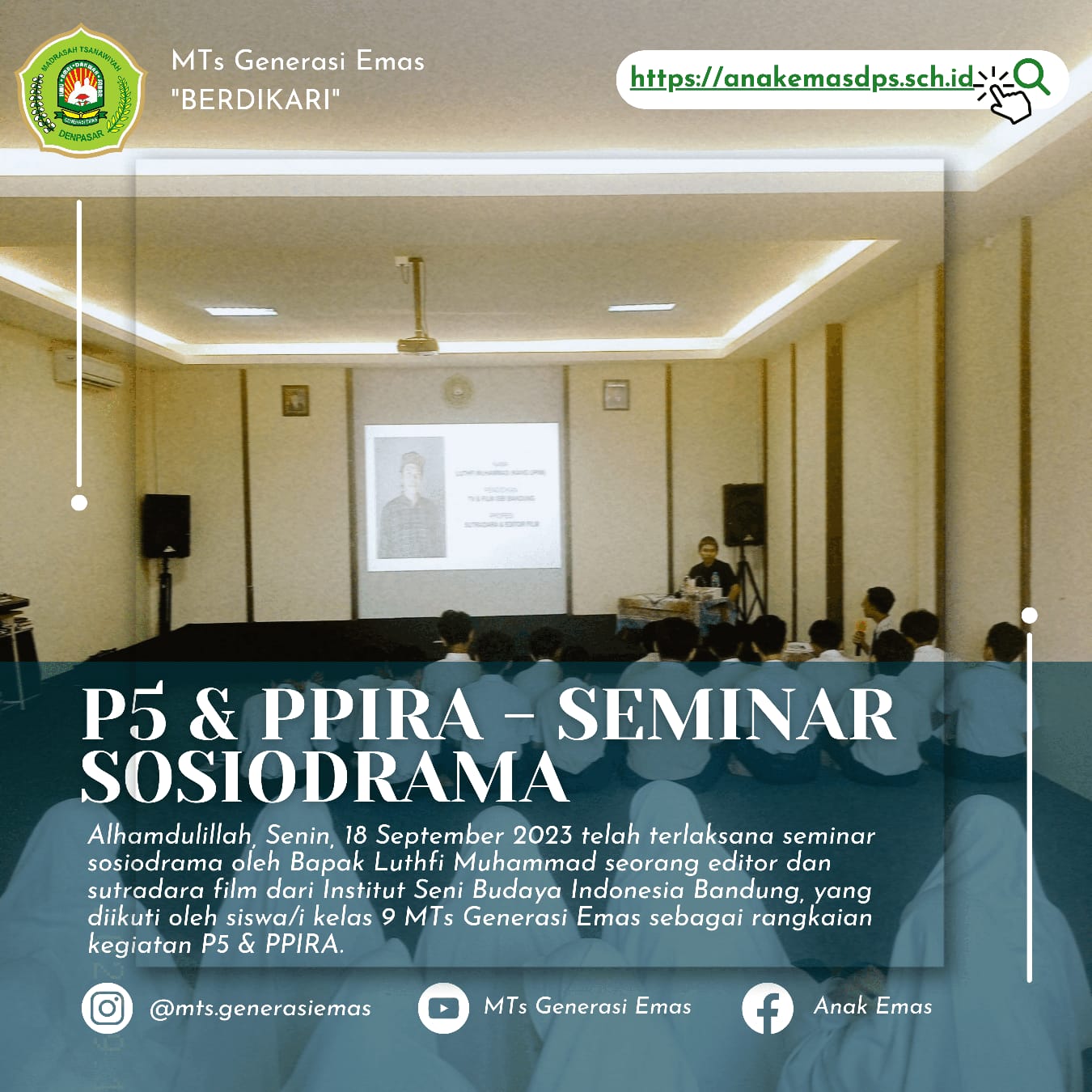 Alhamdulillah, Senin, 18 September 2023 telah terlaksana seminar sosiodrama oleh Bapak Luthfi Muhammad seorang editor dan sutradara film dari Institut Seni Budaya Indonesia Bandung, yang diikuti oleh siswa/i kelas 9 MTs Generasi Emas sebagai rangkaian kegiatan P5 & PPIRA.