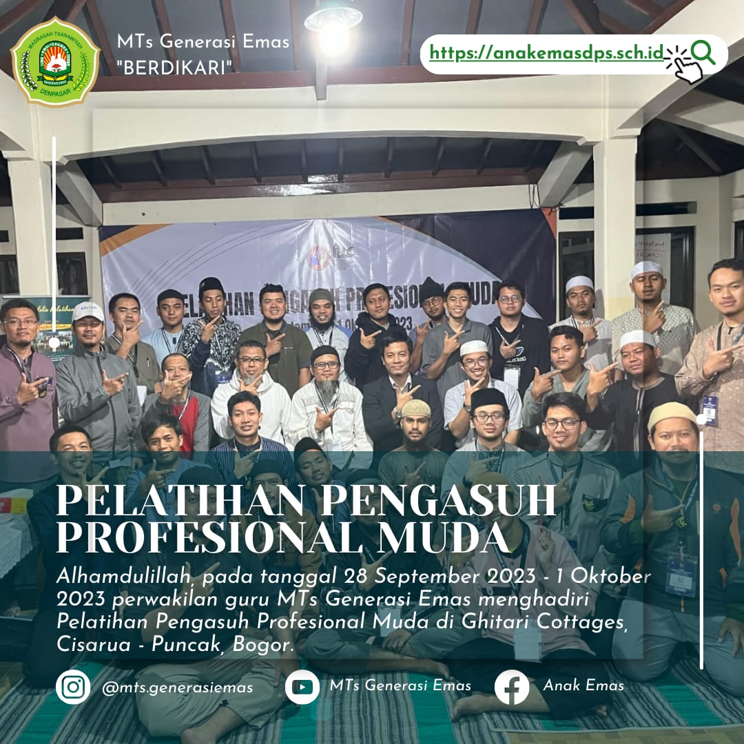 Alhamdulillah, pada tanggal 28 September 2023 – 1 Oktober 2023 perwakilan guru MTs Generasi Emas menghadiri Pelatihan Pengasuh Profesional Muda di Ghitari Cottages, Cisarua – Puncak, Bogor.