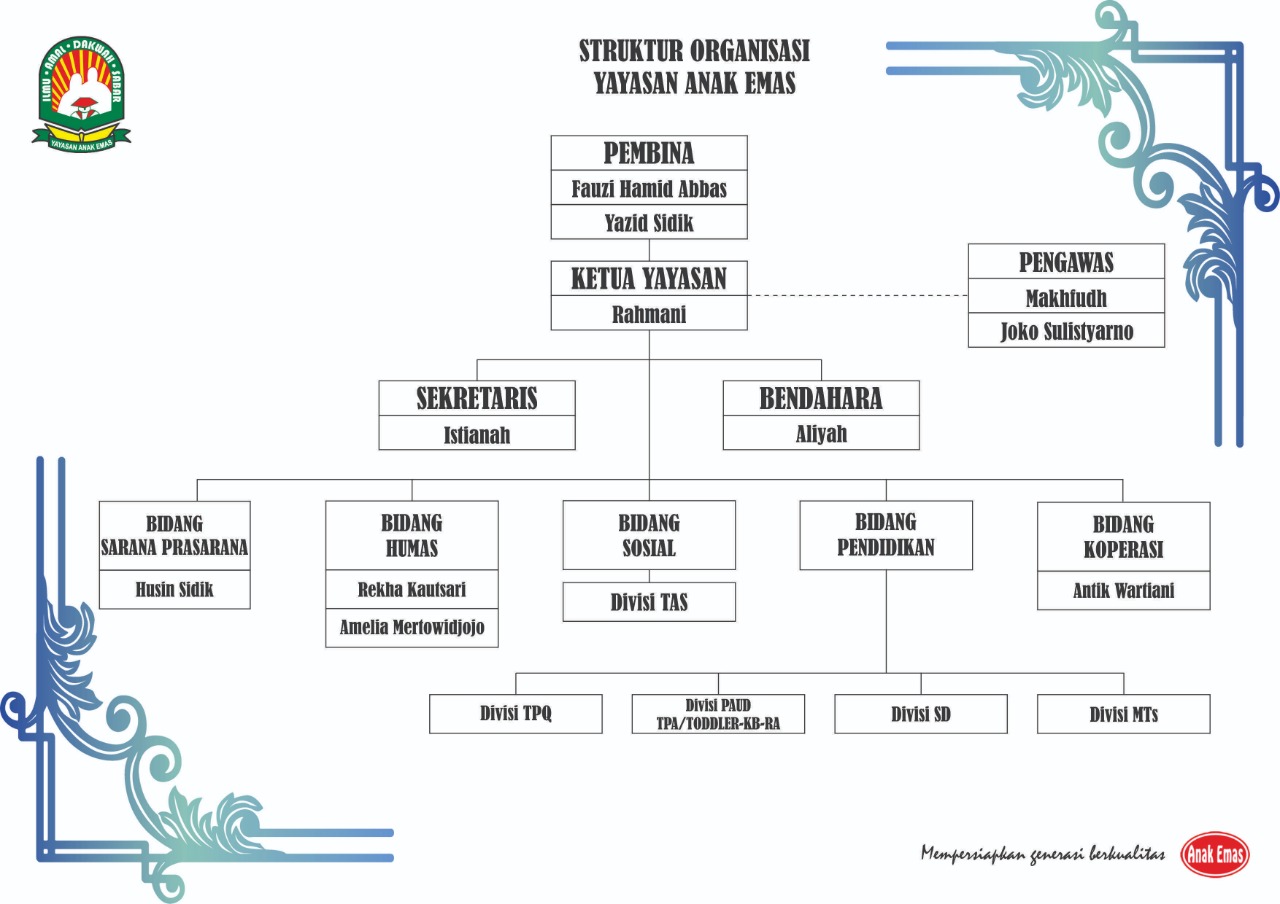 Setelah keluarnya undang-undang yang terbaru tentang Yayasan, terbentuk susunan struktur Yayasan Anak Emas yang tercatat pada akta notaris no. 18 tanggal 13 November 2006 yang dibuat oleh Notaris Herri Yudhianto Putro, SH dan telah disahkan oleh Menteri Hukum Dan Hak Asasi Manusia Republik Indonesia, no. C-1399.HT.01.02.Th.2007 tanggal 25 April 2007 dengan susunan sebagai berikut: