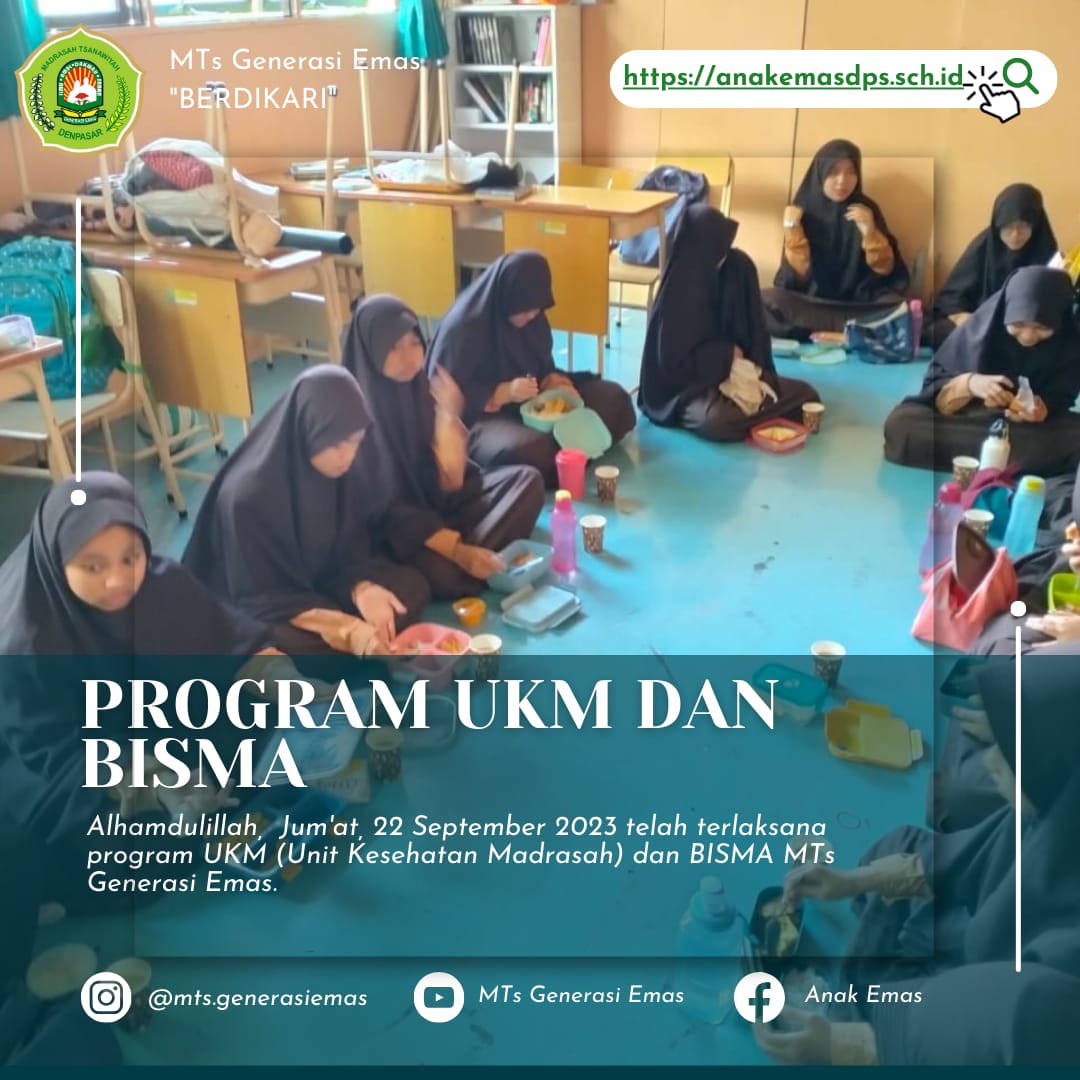Alhamdulillah, Jum’at, 22 September 2023 telah terlaksana program UKM (Unit Kesehatan Madrasah) dan BISMA MTs Generasi Emas.