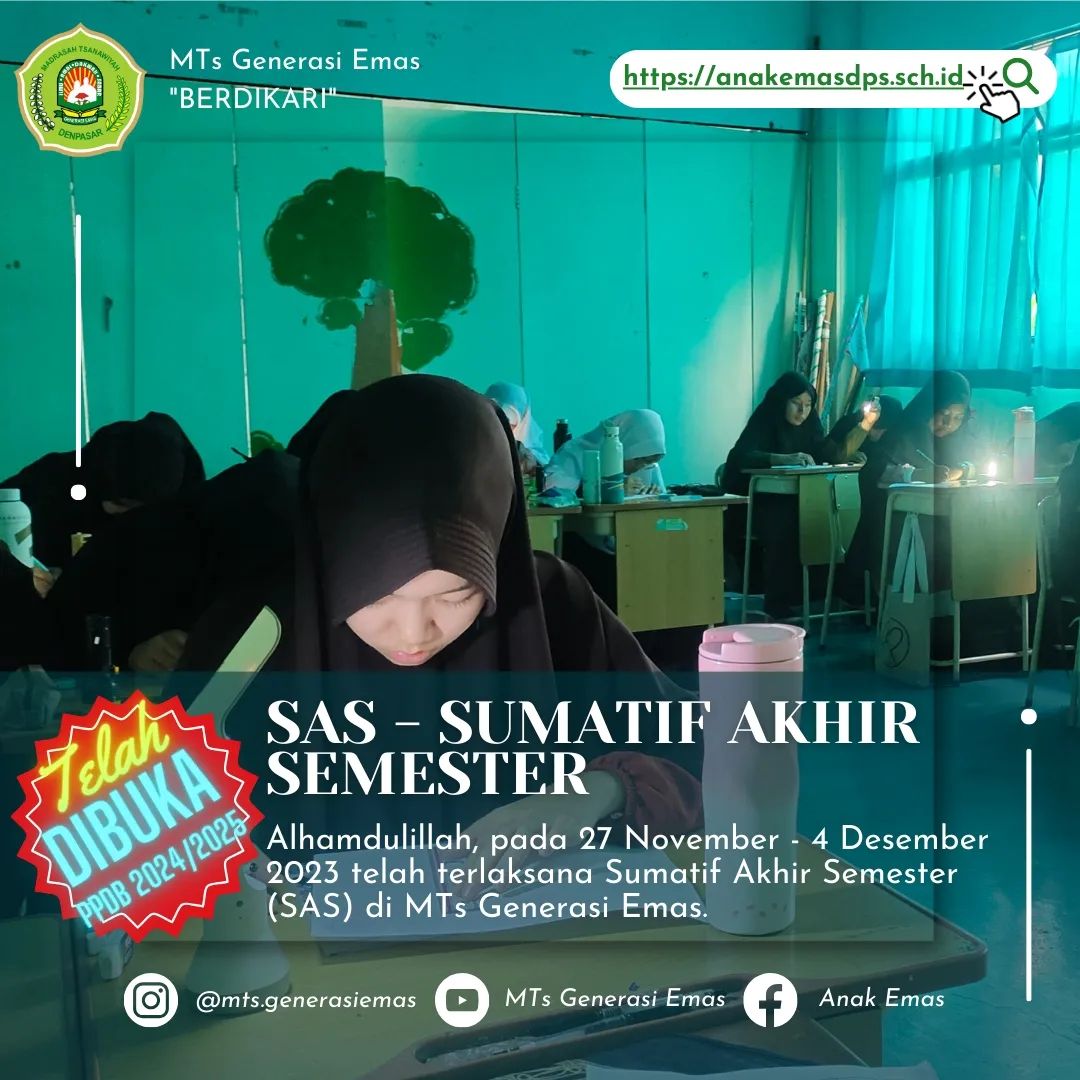 Alhamdulillah, pada 27 November – 4 Desember 2023 telah terlaksana Sumatif Akhir Semester (SAS) di MTs Generasi Emas.
