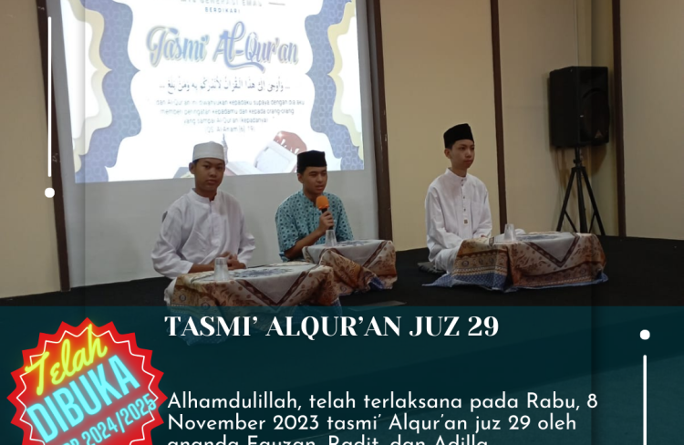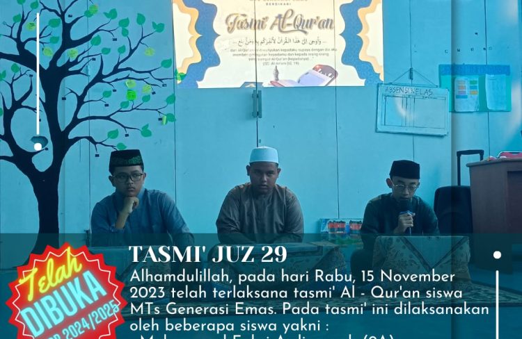 Alhamdulillah, pada hari Rabu, 15 November 2023 telah terlaksana tasmi’ Al – Qur’an siswa MTs Generasi Emas. Pada tasmi’ ini dilaksanakan oleh beberapa siswa...