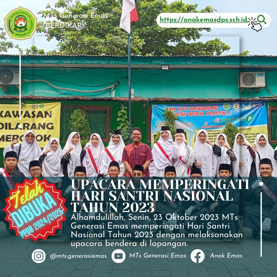 Alhamdulillah, Senin, 23 Oktober 2023 MTs Generasi Emas memperingati Hari Santri Nasional Tahun 2023 dengan melaksanakan upacara bendera di lapangan.