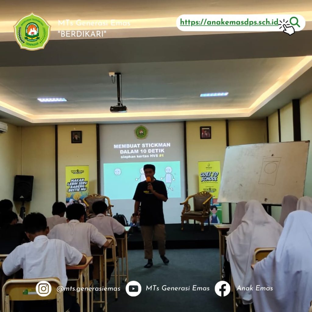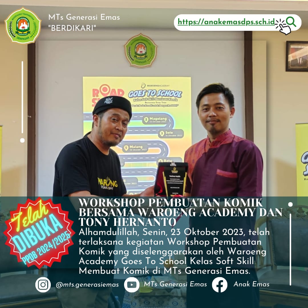 Alhamdulillah, Senin, 23 Oktober 2023, telah terlaksana kegiatan Workshop Pembuatan Komik yang diselenggarakan oleh Waroeng Academy Goes To School Kelas Soft Skill Membuat Komik di MTs Generasi Emas.